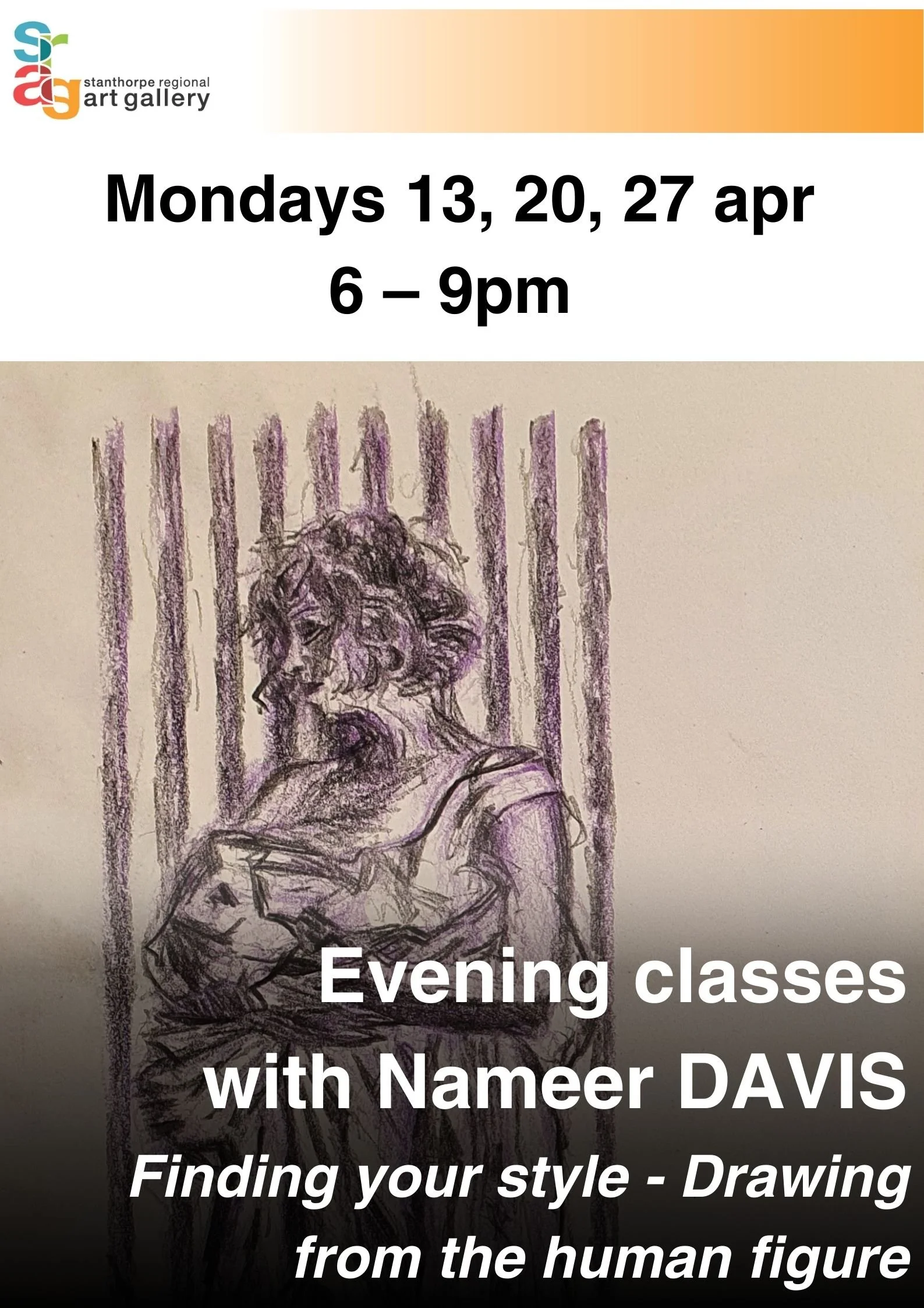 Please bring any dry media you like to draw with such as graphite, pencils, pens, charcoal, conté, pastel and A3 white cartridge or tinted /unbleached paper.